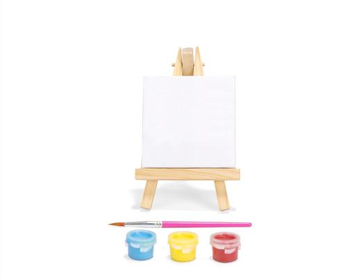Ce kit de peinture comportant trois pots d'acrylique, un pinceau, une toile et un chevalet.