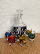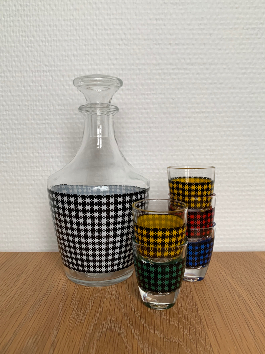 Service à liqueur années 60 à motif vichy/pied de poule composé d'une carafe et de 5 petits verres colorés.